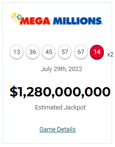 [2022년 7월 26일 업데이트] 추첨 결과 당첨자가 나오지 않아서 이제 메가 밀리언스 당첨금은 $1.28 billion으로 늘어났다. 2022년 7월 26일 당첨 번호는 7 29 60 63 66 15 x3이다.