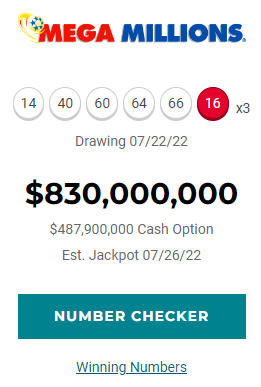 퇴근 후 뉴스를 둘러보는데, 현재 메가 밀리언스 (Mega Millions®)의 2022년 7월 22일 추첨 후 누적 당첨금이 $830 million (현금 수령 시 $487,900,000)에 도달했다는 소식이 있었다. 2022년 7월 26일 환율로 보자면 1,090,968,600,000원 (일조구백구억 육천 팔백육십만 원)이다. 역대 미국 파워볼 (PowerBall) 최고 당첨 금액이 2016년 1월 $1.586 billion (대략 1,925,863,940,000원)이었고, 역대 메가 밀리언스 최고 당첨 금액이 2018년 10월 $1.537 billion이었다는 것을 감안하면 엄청난 금액이다. 참고로 역대 두 번째로 높은 메가 밀리언스 당첨 금액이 2021년 1월 $1.05 billion이었고, 이번 $830 million은 역대 세 번째로 높은 메가 밀리언스 당첨 금액이다.
