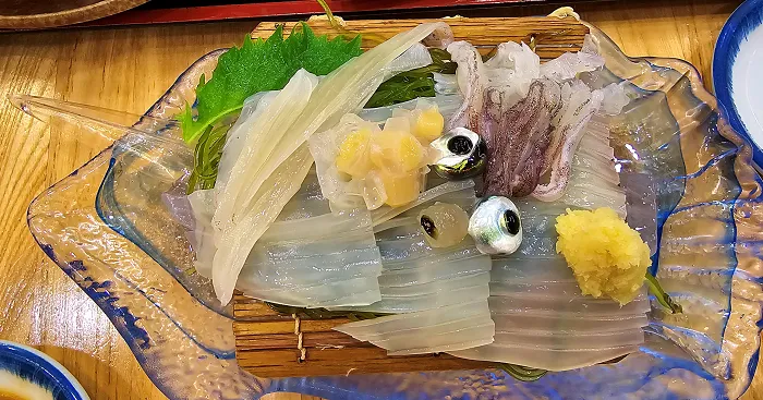 한국에서는 오징어회 또는 한치회 하면 몸통과 다리만 썰어서 나오는 게 보통이지만, 여기서는 오징어의 모든 부분, 심지어 눈알까지 함께 나왔다.