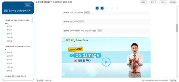 한 강의에 “들어가기(예습)>강의 듣기> 연습하기> 퀴즈> 정리하기”와 같이 체계적으로 학습할 수 있게 구성되어 있으면서 위의 화면과 같이 mp3 파일과 교안을 무료로 제공하고 있다.