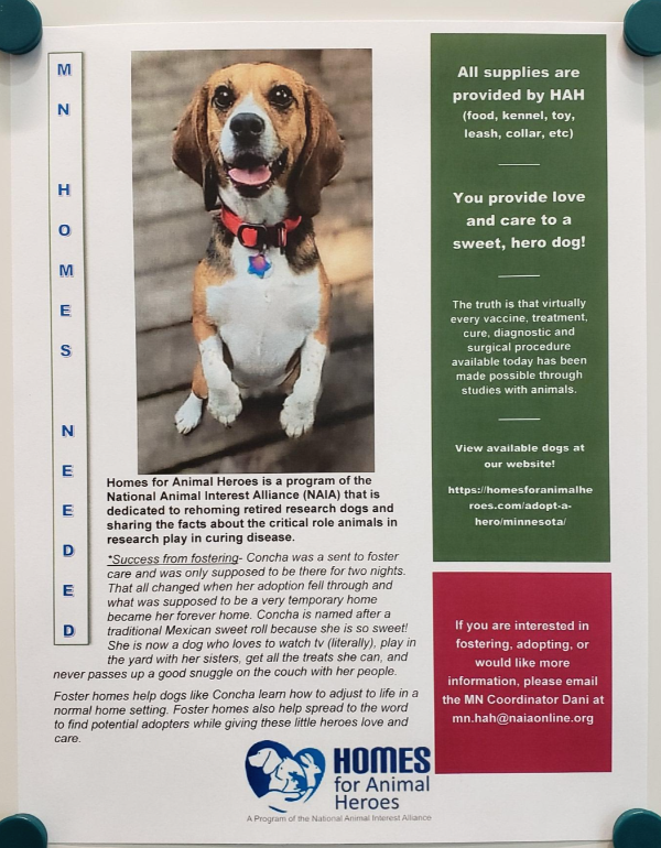Homes for Animal Heroes는 NAIA(National Animal Interest Alliance)의 프로그램의 일환으로 은퇴한 연구견의 입양과 동물 삶의 개선을 위한 교육을 담당한다. 한국에도 이와 비슷한 “비글 구조 네트워크” 단체가 있다.