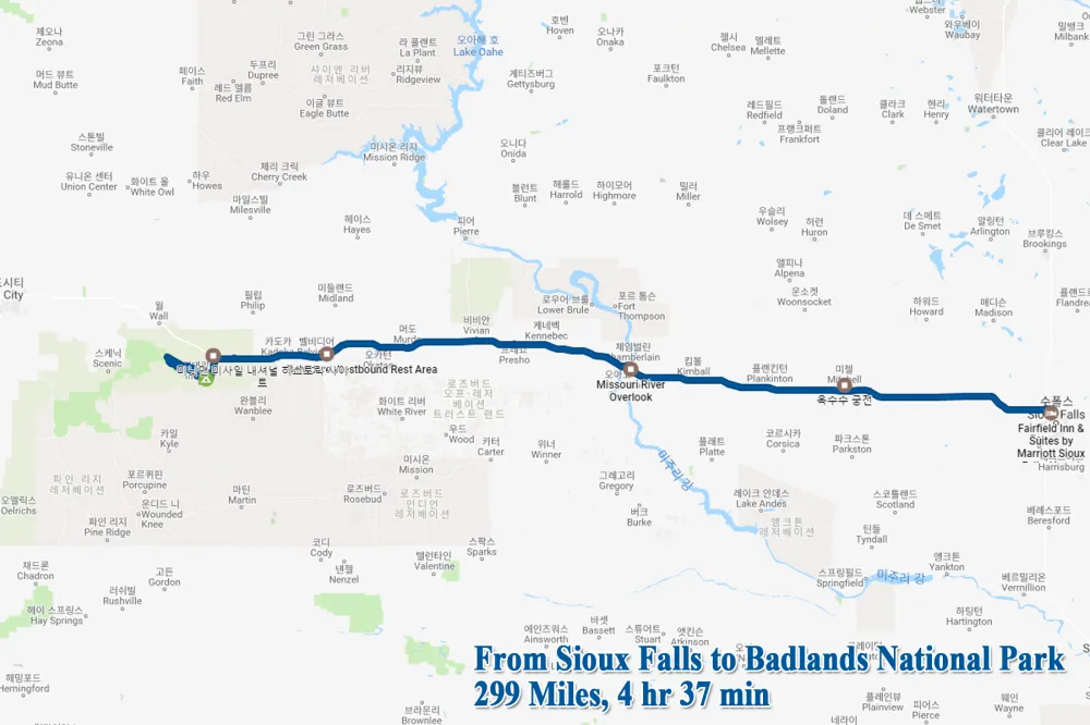 사우스다코타주 수폴스 (Sioux Falls, South Dakota)에서부터 배드랜즈 국립공원까지는 I-90W을 따라 그냥 직진으로만 4시간가량 달리면 된다. 이번 로드트립의 주요 목적지인 배드랜즈 국립공원에 도착하는 날인데, 가는 길에 잠깐 들러서 구경할만한 곳들을 소개하려고 한다.