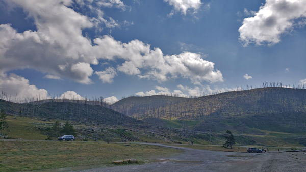 산맥을 지나는 도로에서 내리막길에 접어들면 저 멀리 옐로스톤 레이크가 보이기 시작하고 얼마안가 주변에 불에 탄 나무들이 보이기 시작한다. 옐로스톤 국립공원에서는 산불 (wildfire)이 자주 일어나는데, 대략 78%가 낙뢰 (lightning)에 의해 발생한다고 한다.