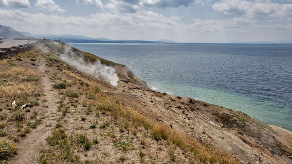 옐로스톤 레이크를 따라 가다보면 유황냄새가 나기 시작하는데 길가의 정차 가능 구간에 차를 세워서 호숫가를 보면 아래 그림처럼 연기가 피어오르고 유황냄새가 나는 구멍들을 볼 수 있다. 다 이름들이 있는 것 같은데 정확히는 모르겠다. 위에 사진의 오른편에 보이는 작은 언덕 같은 곳이 스팀보트 포인트 (Steamboat point)이다. 그리고 조금 더 가다 보면 홈스 포인트 (Holmes point)도 볼 수 있다.