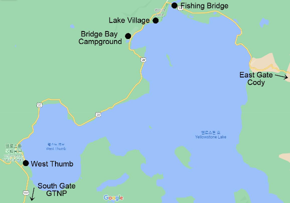 Fishing Bridge를 지나 U.S. Route 20 (“그랑 루프 로드, Grand loop Rd”)를 따라 호숫가를 따라 남쪽으로 내려가다보면 또 다른 YNP 여행 계획 거점인 레이크 빌리지 (Lake Village)와 이번 로드트립 중 캠핑으로 예약한 브리지 베이 캠프그라운드 (Bridge Bay Campground)를 지나가게 된다.