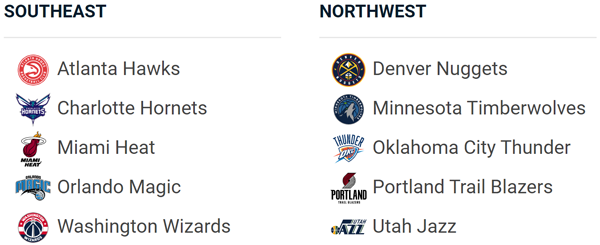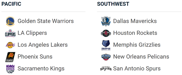 전미 농구 협회 (National Basketball Association, NBA)는 미국의 프로 농구 리그로, 프로 미식축구 리그인 NFL, 프로 야구 리그인 MLB, 북미 아이스하키 리그인 NHL과 함께 미국 4대 프로스포츠로 불린다. 현재 미국 29개팀, 캐나다 1개 팀, 총 30개 팀이 참가하고 있다. NBA 리그는 동부 콘퍼런스와 서부 콘퍼런스로 나뉘며, 각 콘퍼런스에는 각 3개씩의 디비전에 5개 팀씩 구성되어 있다. 동부 콘퍼런스는 애틀랜틱 (Atlantic), 센트럴 (Central), 사우스이스트 (Southeast) 디비전으로 나뉘며, 서부 콘퍼런스에는 노스웨스트 (Northwest), 퍼시픽 (Pacific), 사우스웨스트 (Southwest) 디비전으로 나뉜다. 각 디비전의 소속팀들은 아래 그림에서 찾아볼 수 있다.