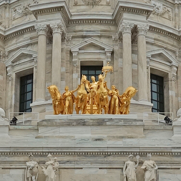 미네소타 주 청사의 돔 아래에 설치된 금색 조각은 라틴어로 4마리의 말이 끄는 마차를 뜻하는 “쿼드리가 (Quadriga)“로 도금된 구리 시트로 제작되었다.