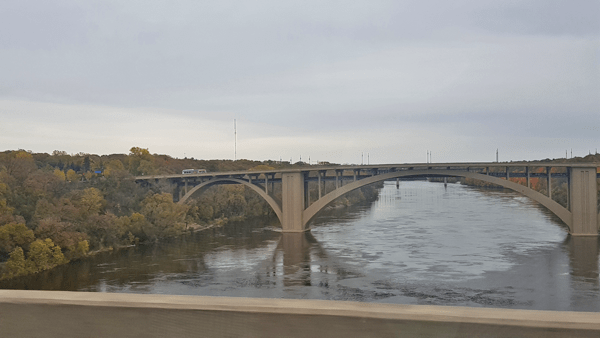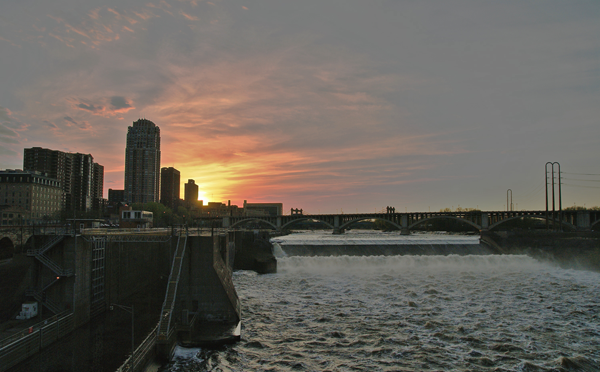 깊이가 성인 무릎 정도이고 돌 몇 개만 건너뛰면 가로지를 수 있는 개울과 같던 미시시피 강이 긴 여정을 통해 미니애폴리스에 도착하면 이렇게 거대해진다.