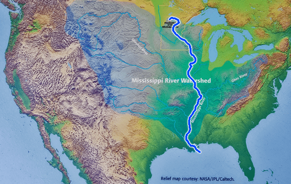 미국을 북남으로 가르지르는 미시시피 강 (Mississippi River)은 미네소타의 북쪽 호수에서 시작된다. 미시시피 강은 총길이 2,340마일(3,770km)로 미주리 강 (Missouri River; 4,130km)에 이어 미국에서 두 번째로 긴 강이다. 하지만, 미주리 강은 미주리주 세인트루이스 북쪽에서 미시시피 강과 합류하기 때문에 미주리 강을 미시시피 강의 큰 지류로 본다. 그 외에도 미국에서 6번째로 긴 강인 아칸사스 강 (Arkansas River; 2,322km)와 10번째로 긴 강인 오하이오 강 (Ohio River; 1,575km)도 미시시피 강에 합류하여 미국 남쪽의 멕시코만 (Gulf of Mexico)까지 흐른다.