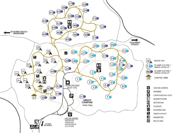 비지터 센터(Visitor center)를 지나 진입하면 위쪽으로 50 amp electric/water hook up site들이 자리 잡고 있고, 오른쪽 편으로 30 amp/water hook up site들이 자리 잡고 있다. 왼쪽 편으로 전기 사용이 불가능한 site들이 자리 잡고 있다. 각 loop들이 중앙에 각각 화장실과 샤워실이 있어 각 site들에서 편하게 이용이 가능했다. 개인적으로 이곳이 마음에 들었던 이유가 대부분의 사이트들이 독립적이고 넓었다. 주변이 대부분 나무로 둘러쌓여 있어 아늑한 느낌이었다.