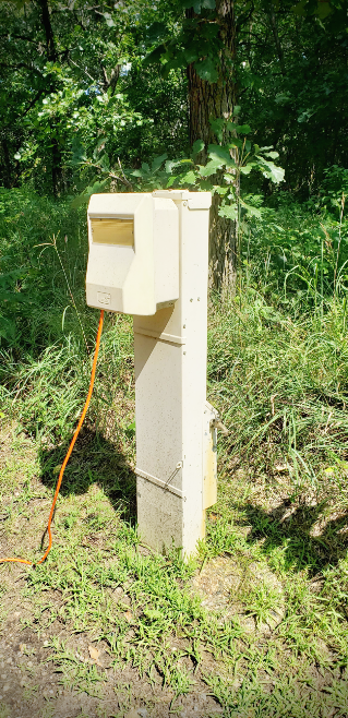 전기가 가능한 사이트들은 입구쪽에 이렇게 전기를 연결할 수 있게 되어 있다. 저 주황색 선이 들어가 있는 뚜껑을 열어보면, 30-amp outlet 과 120v basic outlet이 있어 바로 연결할 수 있다. 뒤편으로는 수도를 연결할 수 있는 시설이 함께 있다.