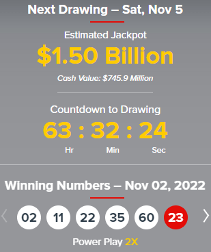 [업데이트] 2022년 11월 2일 파워볼 추첨에서 1등 Jackpot 당첨자가 나오지 않았다. 현재 누적 당첨금은 $1.5 Billion (현금수령시 $745.9 Million)까지 늘었다. 최근 환율을 바탕으로 한화로 2,140,080,000,000원 (2조 1천4백억 8천만원)이다. 이번 추첨에서는 2등 당첨 3명, 3등 당첨 12명이 나왔다. 당첨번호는 02 11 22 35 60 23 (powerball)이다.
