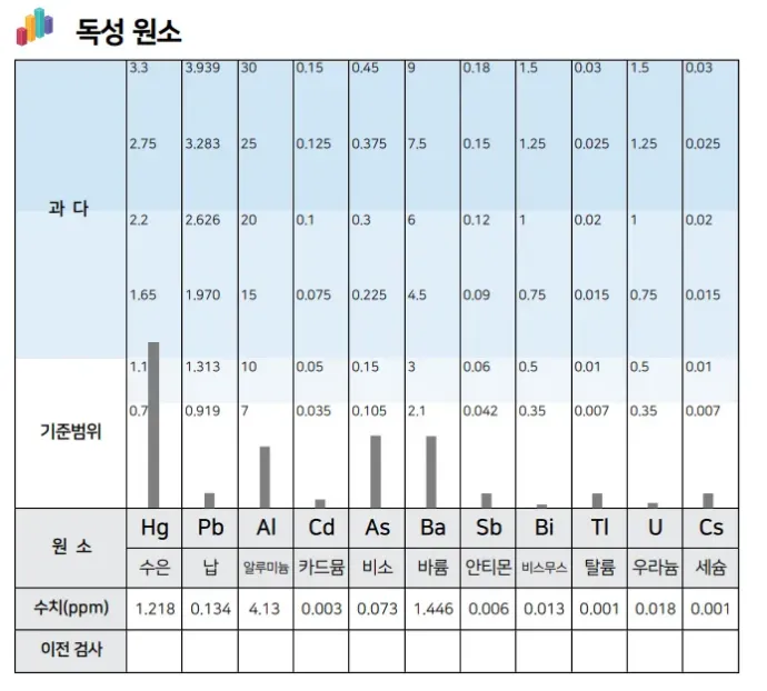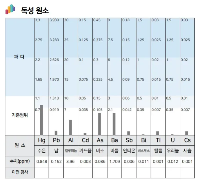 위의 결과는 나의 중금속 결과이고, 아래는 남편의 결과이다. 같이 살아서 모든 패턴이 동일하였다.