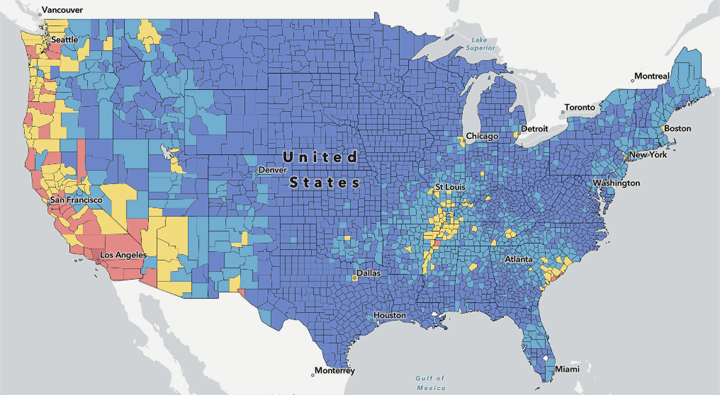 아래 지도에 표시된 것처럼 대부분의 지진 위험 지표는 태평양 연안을 따라 자리 잡은 워싱턴, 오레곤, 캘리포니아에 주로 높게 표시된 것을 확인할 수 있다.