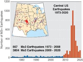 오클라호마에도 “Meers Fault”라는 22~26 km 길이의 활성 단층이 하나 존재하고 약 1100년 전에 규모 7 정도의 지진을 발생시켰던 것으로 조사되어, 잠재적 지진 위험으로 여겨져 모니터링을 하고 있는 중이란다. 하지만, 오클라호마에서는 지진 발생 빈도가 급격하게 증가하는데, 이는 단층의 활성에 따른 지진이 아닌 기름을 뽑아 올리기 위한 시추정에 물을 주입 처리하는 과정에서 발생하는 지진으로 보고 있다.