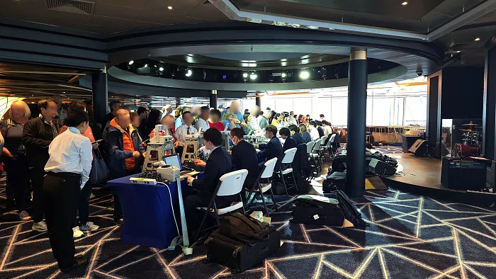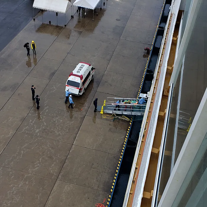 입국 심사를 위한 직원들이 크루즈 선박에 탑승하고 12층에 입국 심사 데스크가 설치된다.