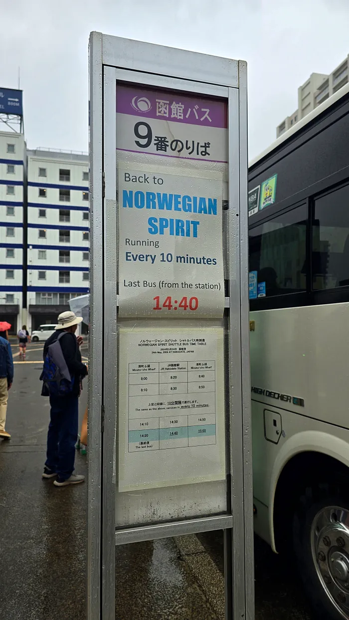 노르웨지안 스피릿이 정박한 곳은 도심에서 조금 떨어져 있는 접안 시설이었다. 주변에 편의 시설 등은 전혀 없어 셔틀버스를 타고 도심으로 진입해야 한다. 무료 셔틀버스가 제공되어 하선하고 셔틀버스를 타면 하코다테 교통 중심이라고 할 수 있는 JR하코다테 역까지 갈 수 있다.