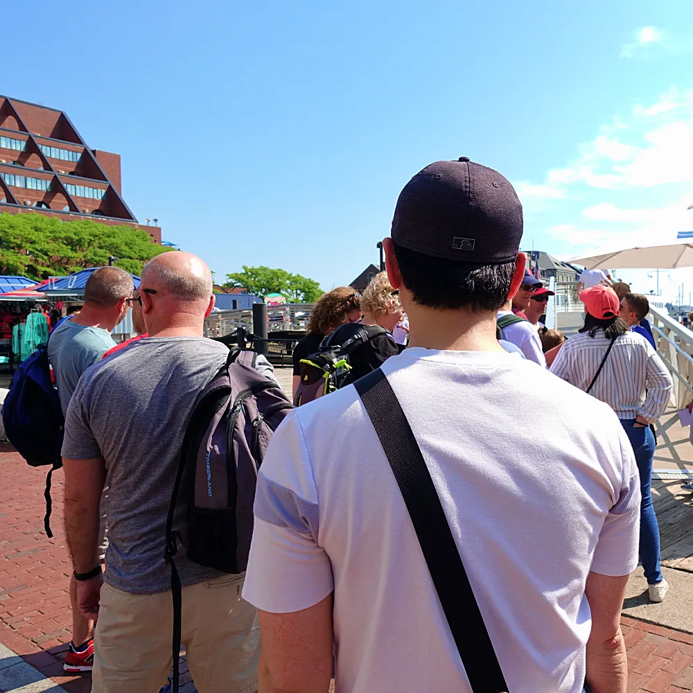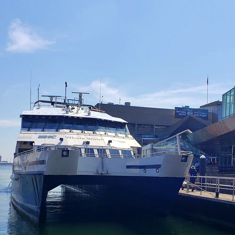 투어에 사용되는 배는 뱃머리가 두 개가 있는 쌍동선인데, 뉴잉글랜드 아쿠아리움 바로 옆 One Long Wharf 부두에서 탑승을 한다. 고래 관찰하는 포인트에 다다르면 저 두 곳의 뱃머리에는 사람들로 가득 차서 출발할 때부터 저곳에서 서서 강한 바닷바람을 맞아가며 자리를 지키는 사람도 있다.