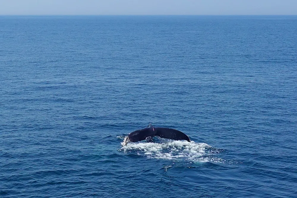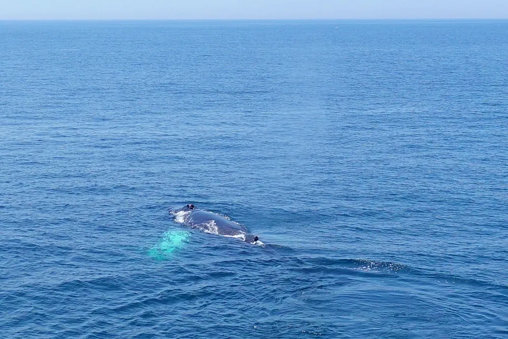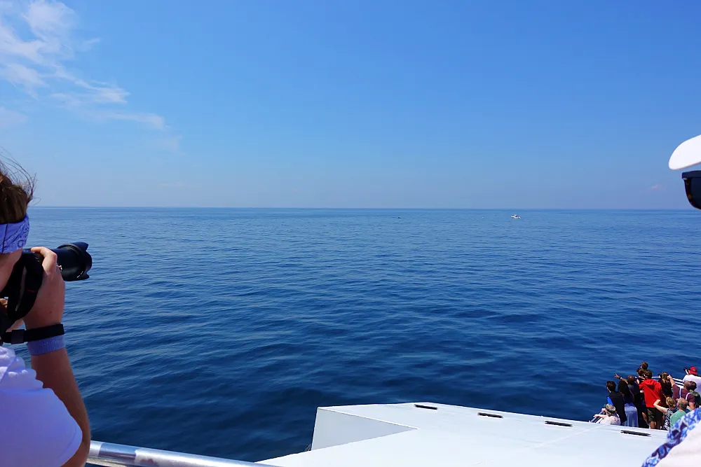 고래 서식지에 도착하면 연구원들이 배의 높은 곳에서 망원경을 이용해 주변의 고래 흔적을 찾고, 찾으면 큰 소리로 “어느 방향”이라고 외쳐준다. 그럼 사람들이 일제히 그쪽을 향해 길게 고개를 빼들고 카메라 셔터를 눌러댄다. 처음에는 너무 멀어서 잘 보이지도 않는다.