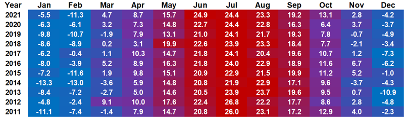 일단, 미네소타의 겨울 날씨는 정말 춥다. 아래 히트맵에 2011년부터 2021년까지 미네소타의 월평균 기온을 표시해봤다. 10월부터 기온이 떨어지기 시작해서 4월까지 쌀쌀하다. (가끔 자동차 계기판의 기온이 “-26℉(섭씨 -32도)”를 찍어 아침에 자동차 시동이 힘겹게 걸릴때가 가끔씩 있다. 여기에 바람이라도 부는 날이면 약간의 과장을 더해서 체감온도 섭씨 -40 ~ -50도?).