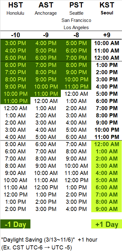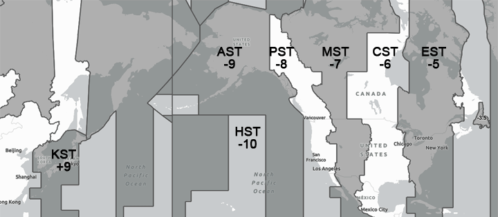 먼저 한국은 Korea Standard Time (KST)로 UTC+9이다. 미국의 시간대들은 아래 표에 정리했다. UTC에 가까운 동쪽에서 서쪽 순서이며, 일광 절약 시간제를 시행할 때를 따로 표시했다 (*DT).