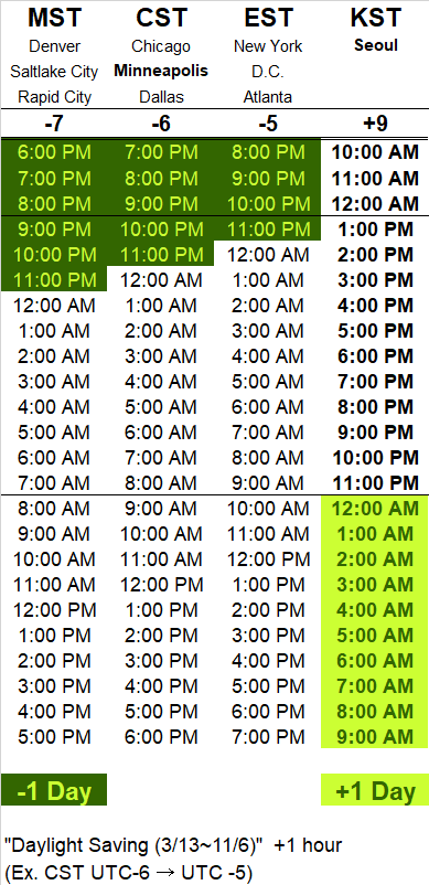 미니애폴리스 현지시간 2022년 9월 1일 오후 6시를 기준으로 서울과 미니애폴리스의 시차를 계산해 보자. (미네소타는 현재 일광 절약제 시행 중이다. 그렇기 때문에 CDT를 기준으로 한다.)