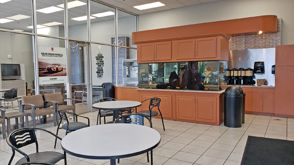 딜러쉽의 메인 입구와 전시장의 뒤편으로는 서비스 창구가 자리 잡고 있다. 보통 차량을 구입한 딜러쉽에서 정기점검이나 고장 점검, 등을 받게 되는데, “Toyota Owners” 웹사이트에서 점검 범위와 스케줄을 예약을 하고 예약한 날짜와 시간에 맞춰 아래 사진의 서비스 창구로 진입하면 해당 어드바이저가 서비스 접수를 하고 서비스에 대한 간단한 설명을 해준다.