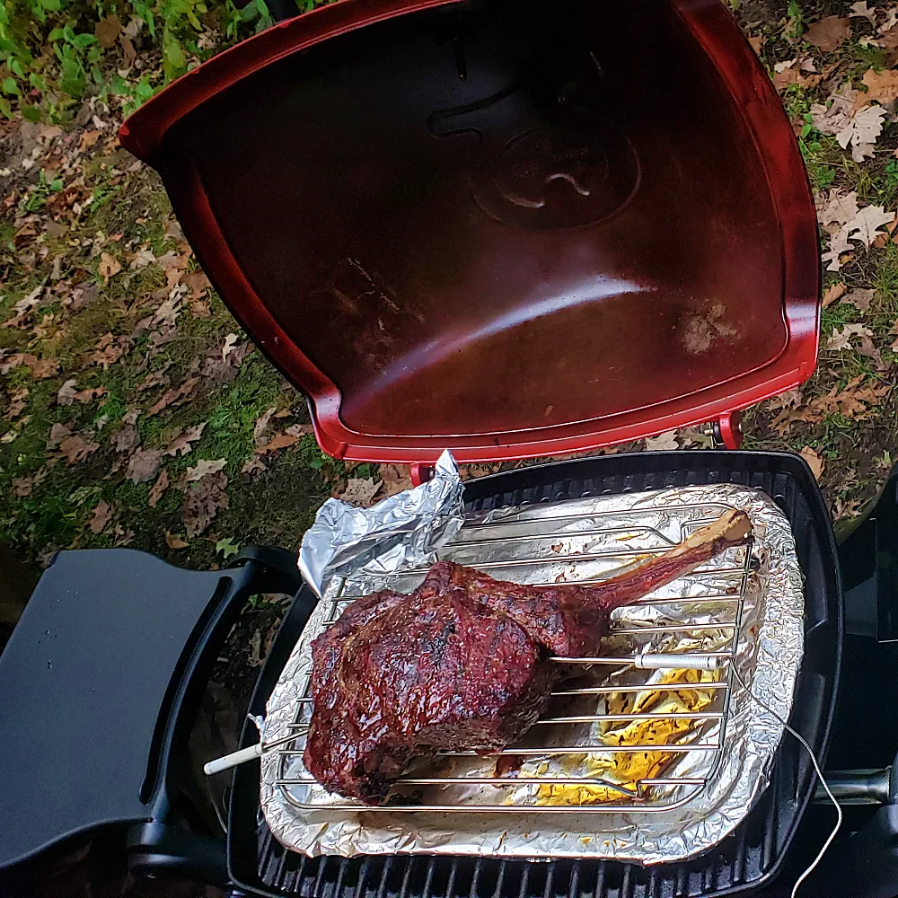 6. 그릴 마크가 잘 만들어졌으면 간접구이 렉 (Rack)에 토마호크를 올리고 고기 심부 온도계 (Meat Internal Thermometer)를 꽂고 그릴 위에 올린 후 뚜껑을 닫는다.