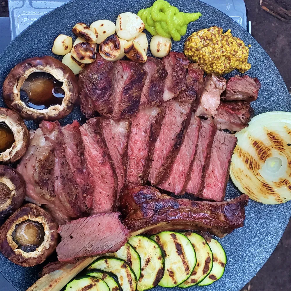 이번 캠핑에는 코스트코 비즈니스센터에서 구입한 토마호크 스테이크 6센티미터짜리 한 덩어리만 들고 갔다. 일본인 친구도 저녁으로 야끼소바를 준비해서 함께 먹으니 성인 4명이서 충분히 먹을 수 있을 양이었다. 보통 즐겨 먹는 미디엄 레어나 미디엄이었다면 더 부드러운 스테이크를 즐길 수 있었겠다는 아쉬움이 있다.