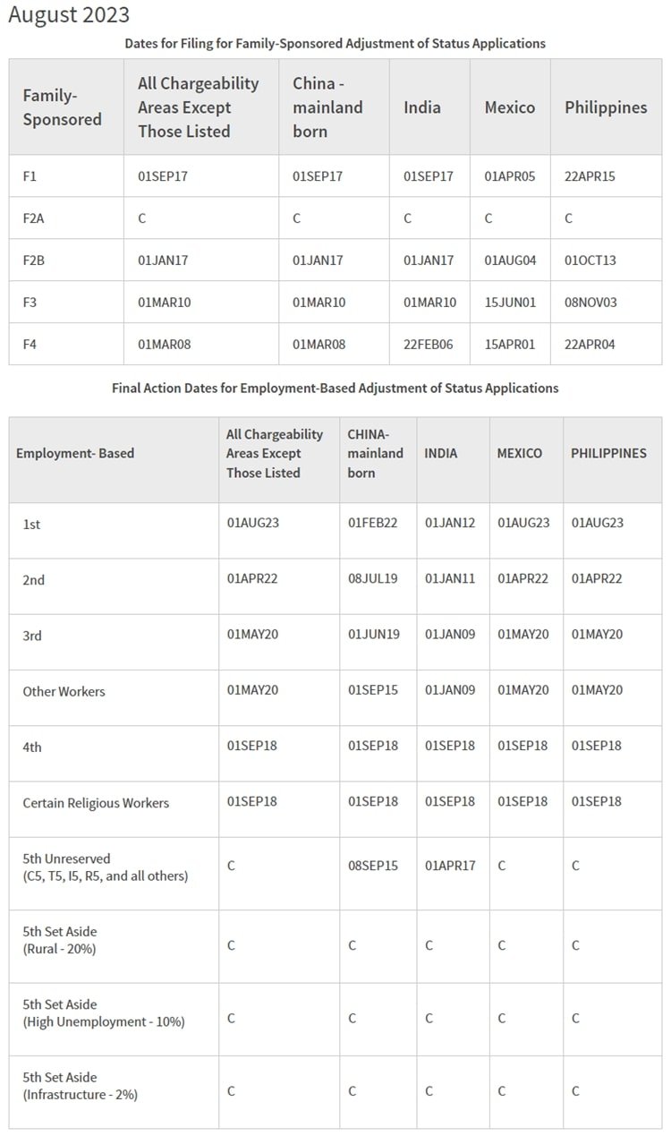 2023년 8월 미국 가족초청 또는 취업 기반 영주권 문호 (門戶)가 발표됐다. 미국 영주권 문호차트는 “신분 변경 신청서 (Adjustment of Status Application (I-485)” 접수가 가능한 날짜를 확인할 수 있는 차트로, 매달 중순쯤 다음 달에 적용될 새로운 날짜들이 발표된다.