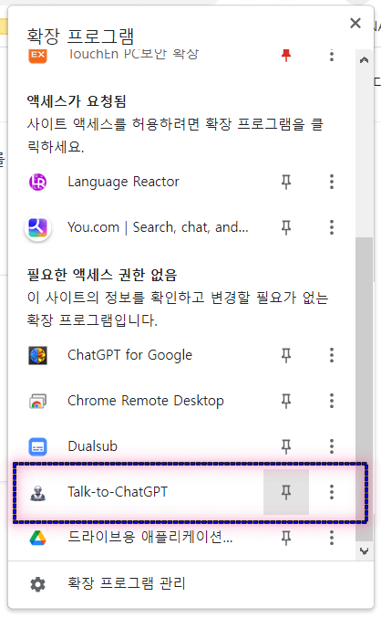 설치가 끝나면, 크롬 오른쪽 상단의 퍼즐모양 아이콘의 “확장 프로그램”을 클릭하여 “Talk-to-ChatGPT”를 선택하자. 크롬 확장 프로그램에 새롭게 추가된 “Talk-to-ChatGPT” 아이콘을 클릭하면 간단한 설명을 볼 수 있다.