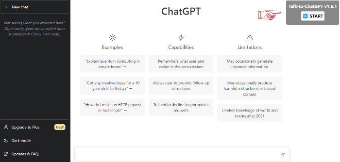“START” 버튼을 누르기 전에는 기존에 사용하는 방식 그대로 사용이 가능하고, “START”버튼을 누르면 음성으로 명령어를 입력하고, ChatGPT의 출력 메시지도 음성으로 들어볼 수 있다. Talk-to-ChatGPT가 실행 중인 상태에서도 문자 입력을 통한 사용이 가능하지만, ChatGPT 출력 메시지도 음성으로 함께 제공된다.