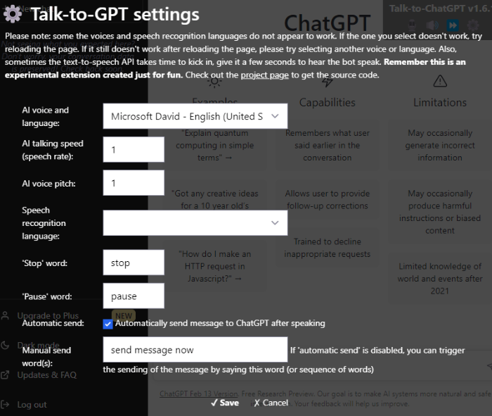Talk-to-ChatGPT 세팅을 통해 음성/언어, 봇 말하기 속도 등을 변경할 수 있다.