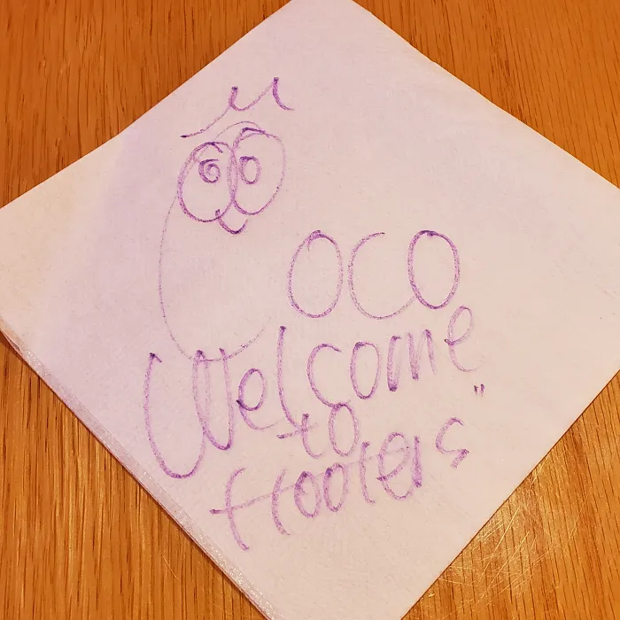 자리에 앉으면 담당 후터스 걸이 무릎을 꿇고 눈높이를 맞춰 메뉴를 설명해 줍니다. 테이블 페이퍼에 본인의 사인을 적어주며 인사를 건네는 모습이 인상적이었는데요.