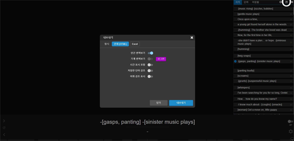 원하는 번역 옵션(원문+번역 등)을 선택한 후 ‘내보내기’를 누릅니다. 엑셀(Excel)이나 HTML 형식으로 깔끔하게 정리된 스크립트를 얻을 수 있습니다.