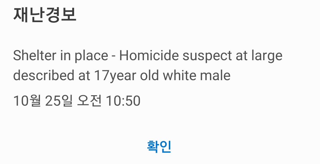 문자 내용은 “Shelter in place – Homicide suspect at large described at 17 year old white male”였다. 번역하자면, “실내 대피 – 살인 용의자 17세 백인 남성”이었다. 내가 있는 가까운 곳에 17세 백인 남성 살인용의자가 있으니 실내로 대피하라는 내용이다. 어린이 납치에 관한 경보인 앰버경보 (AMBER alert)에 관한 자세한 내용은 아래를 참고하자.