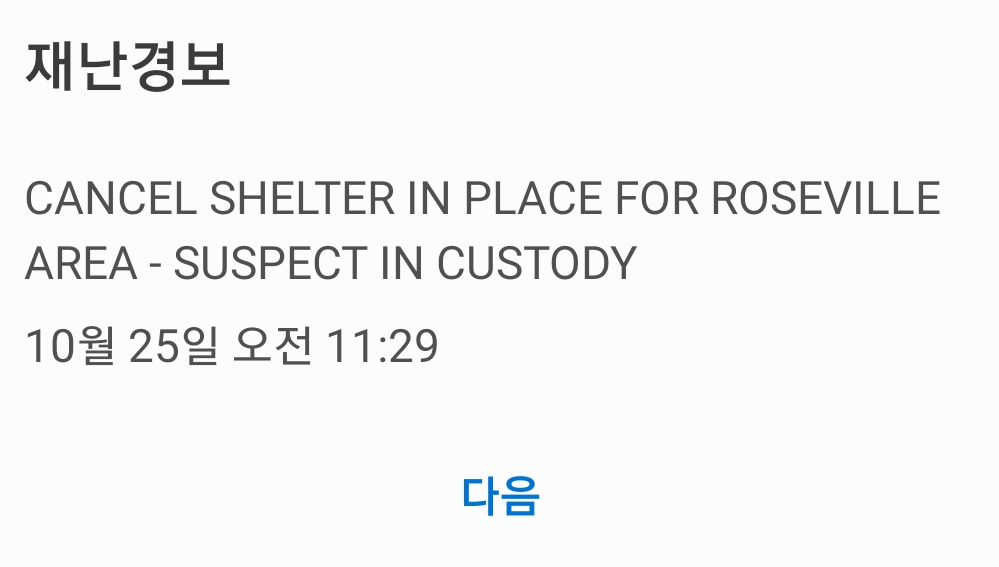 잠시 후 다른 재난경보 알람이 왔고, 이 경보는 로즈빌 지역 (Roseville area)에만 해당한다는 내용이었다.