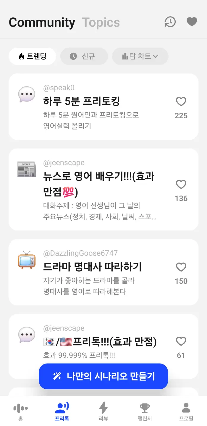 스픽에 관심이 많은 분들은 아마 “틀려야 트인다”라는 슬로건과, 모델들이 AI와 대화하는 모습을 보고 관심을 가질 것이다. 바로 스픽 프리톡의 기능이다. 스픽을 가입하려는 목적이 대화를 많이 하고 발화량을 늘리며 프리토킹을 자유롭게 하는 것이 목적이라면 스픽 프리미엄으로도 괜찮을 것이다. (+ 여기에 제공되는 다양한 영어강의 코스들 이를테면 초급, 중급, 고급 및 비즈니스나 캠퍼스 영어 강의 등은 모두 접근 가능하다.)