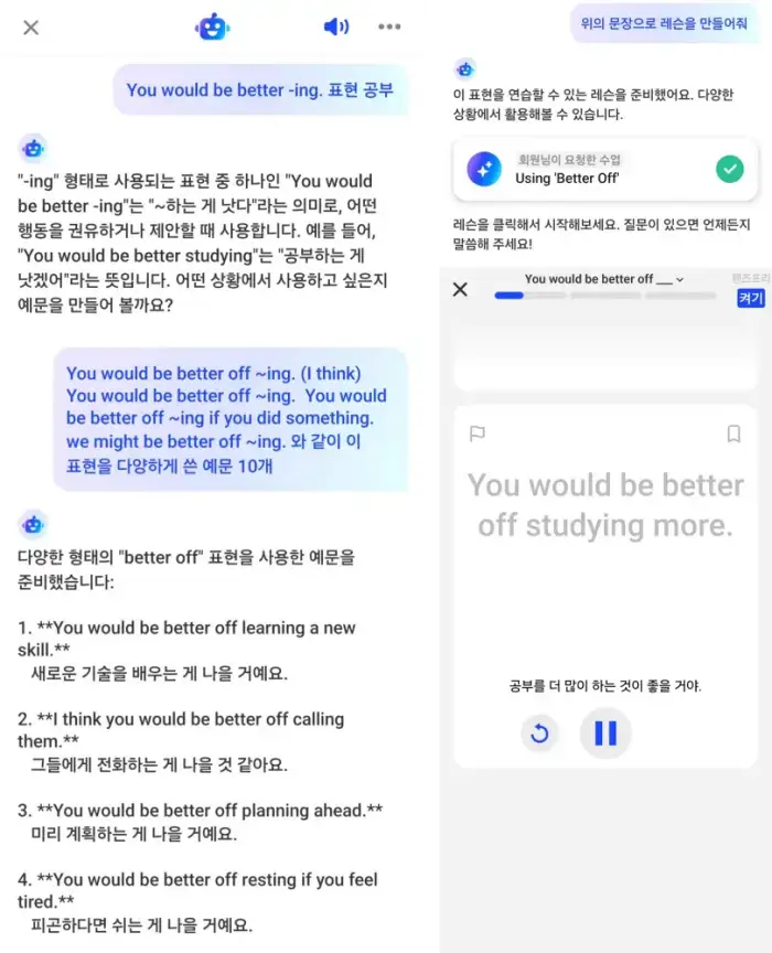 그 다음 차이는 프리톡 후 “맞춤 레슨” 제공이다. 프리톡 후에 대화에서 실수했던 부분들을 자동으로 레슨을 생성하여, 내가 어떻게 말했는지, 왜 틀렸는지를 알려주고 올바른 영어문장을 연습하도록 하는 레슨을 제공한다.
